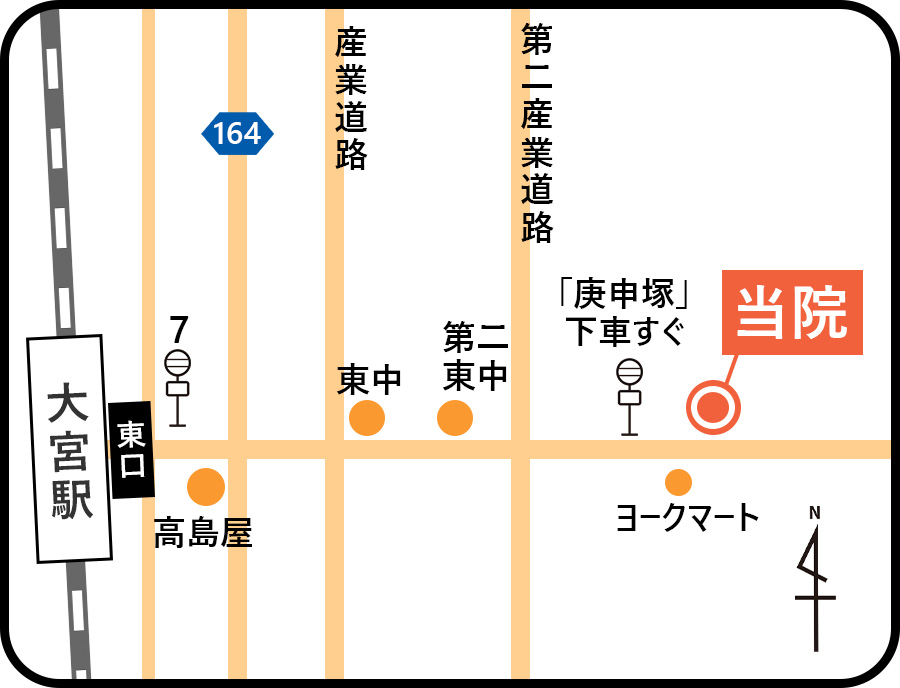大宮駅東口を出て、国際興業バスの7番乗り場(高島屋向かい側)からご乗車ください。「庚申塚(こうしんづか)」下車後すぐ、ヨークマート大宮中野店の向かいです。