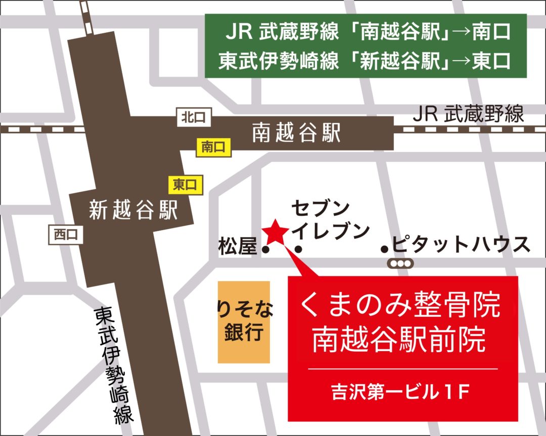 「くまのみ整骨院南越谷駅前院」の所在地・地図はこちらのページでご確認ください。